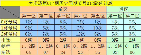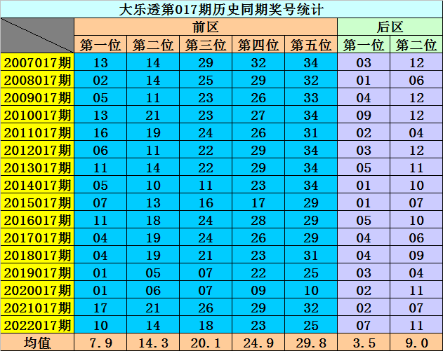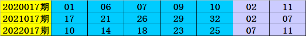 在2020017期-2022017期同周期奖号中,前区连码出现1期,同尾号出现0期,号码奇偶比8:7,大小比7:8,号码012路比4:5:6,前区开出14个号码。