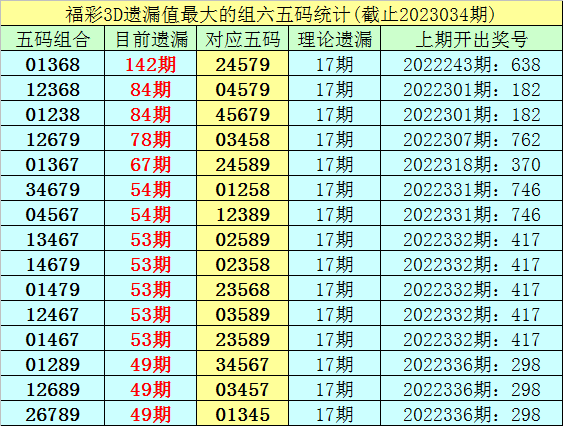 1。放胆第23034期,五码组六遗漏最大的是:01368,面前遗漏142期。