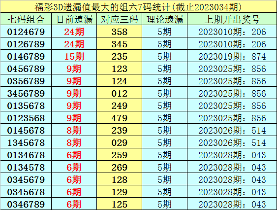 1。放胆第23034期,七码组六遗漏最大的是:0124679、0126789,面前遗漏24期。